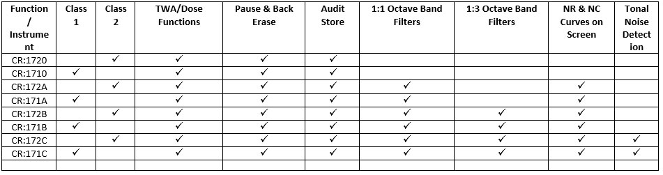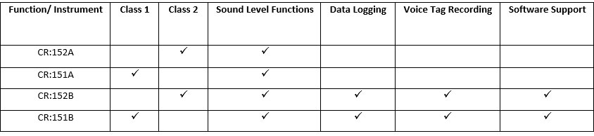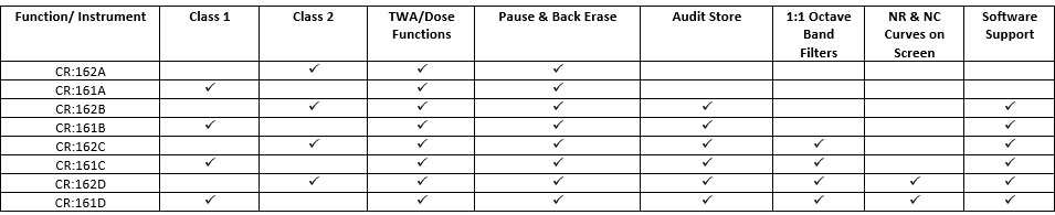 There are 8 versions of the Optimus Red Sound Level Meters, 4 with Class 2 performance and 4 with Class 1 performance. The table below shows the different versions and options available with each instrument.